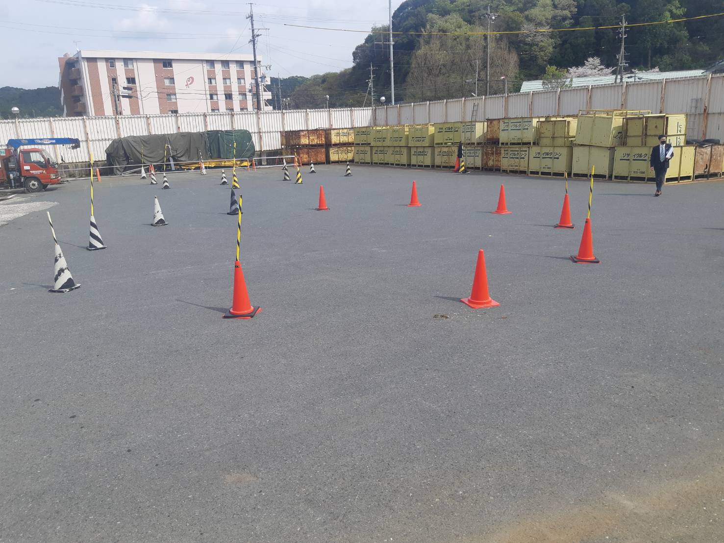 パイロンを当てずに前進進入し中で補助員を置き車輛は切り返しを行い前進で退場する(出入口は同じ)タコツボを実施しタイムを計る