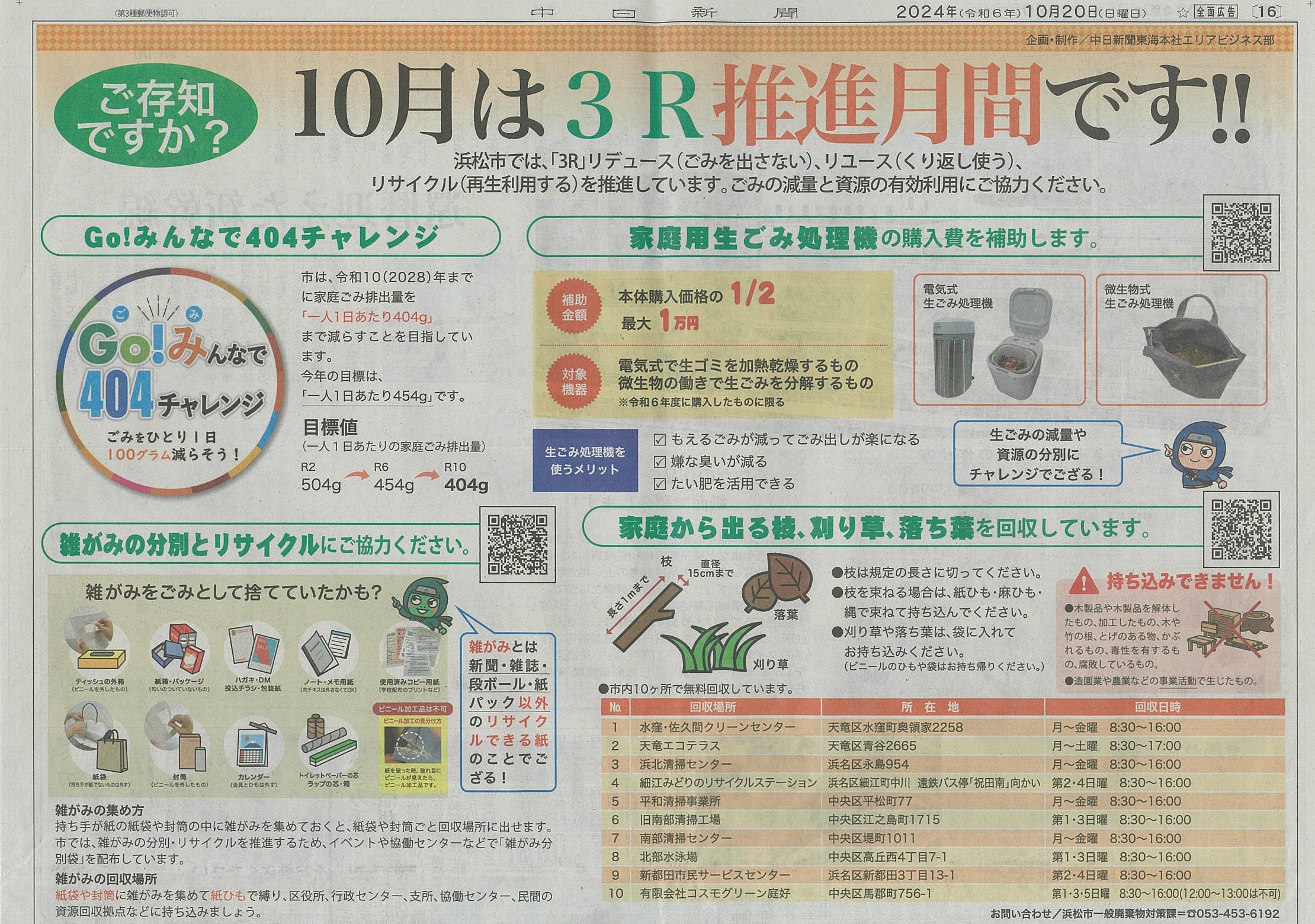 2024年10月20日の中日新聞朝刊「10月は3R推進月間です!!」の全面広告に協賛いたしました。