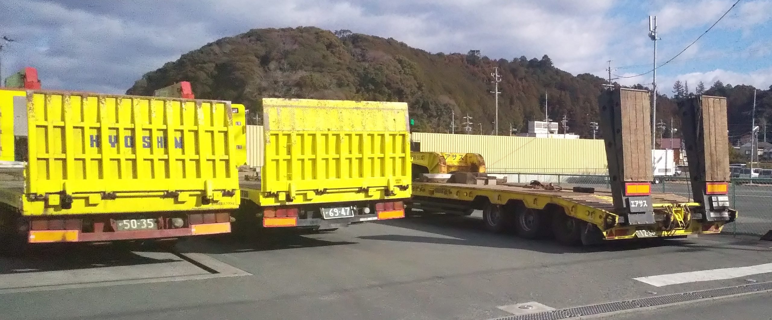 重機の運搬車両です。走行時は前後に安全管理車両を従えていました。