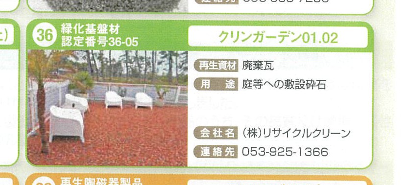 株式会社リサイクルクリーンの「クリンガーデン01(赤).02(黒):廃棄瓦再生品」が静岡県リサイクル製品に認定されました。