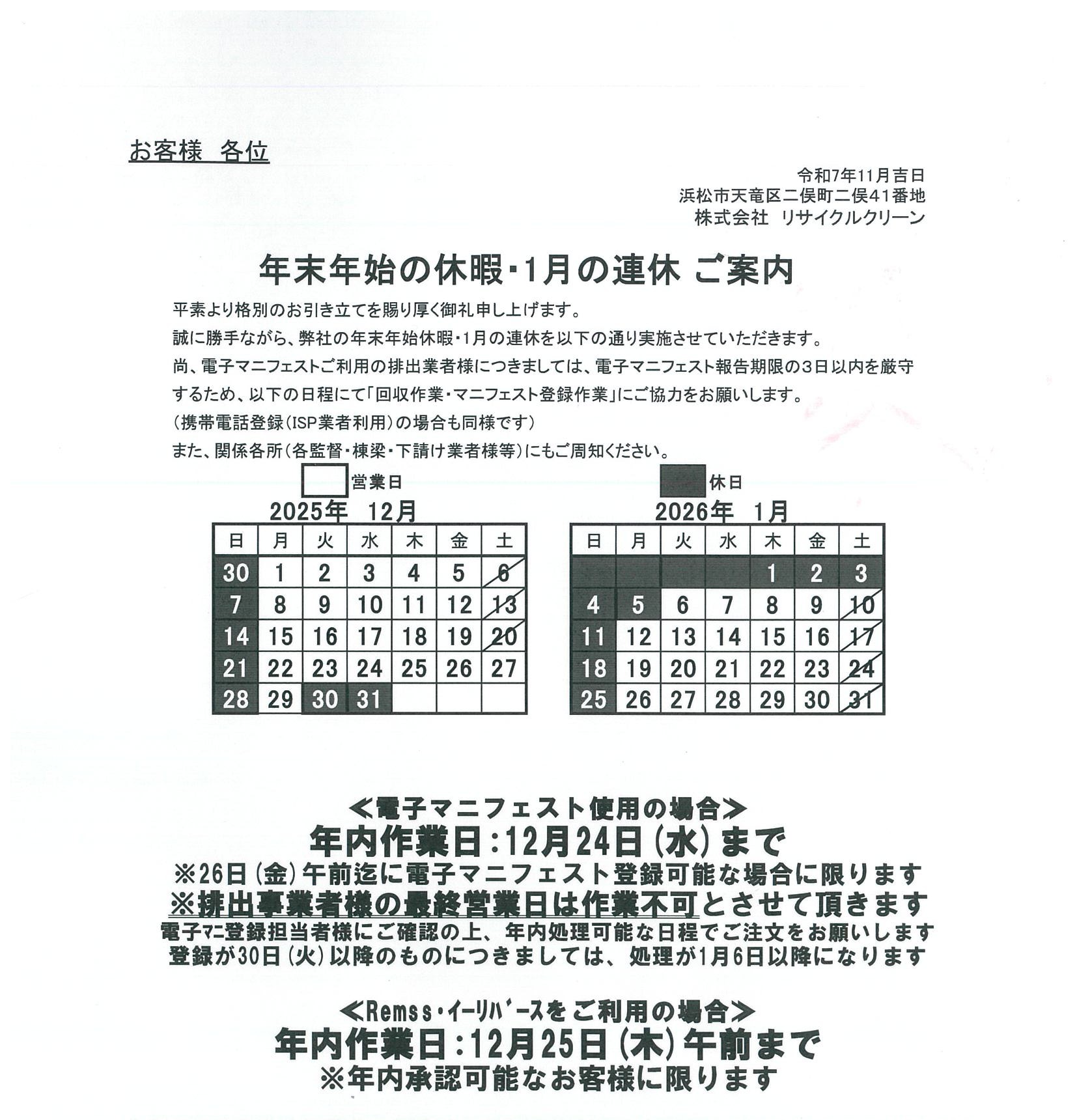 令和7年度の年末年始の営業日程です。今回は曜日の関係で産業廃棄物回収が早じまいとなっております。ご確認お願いいたします。