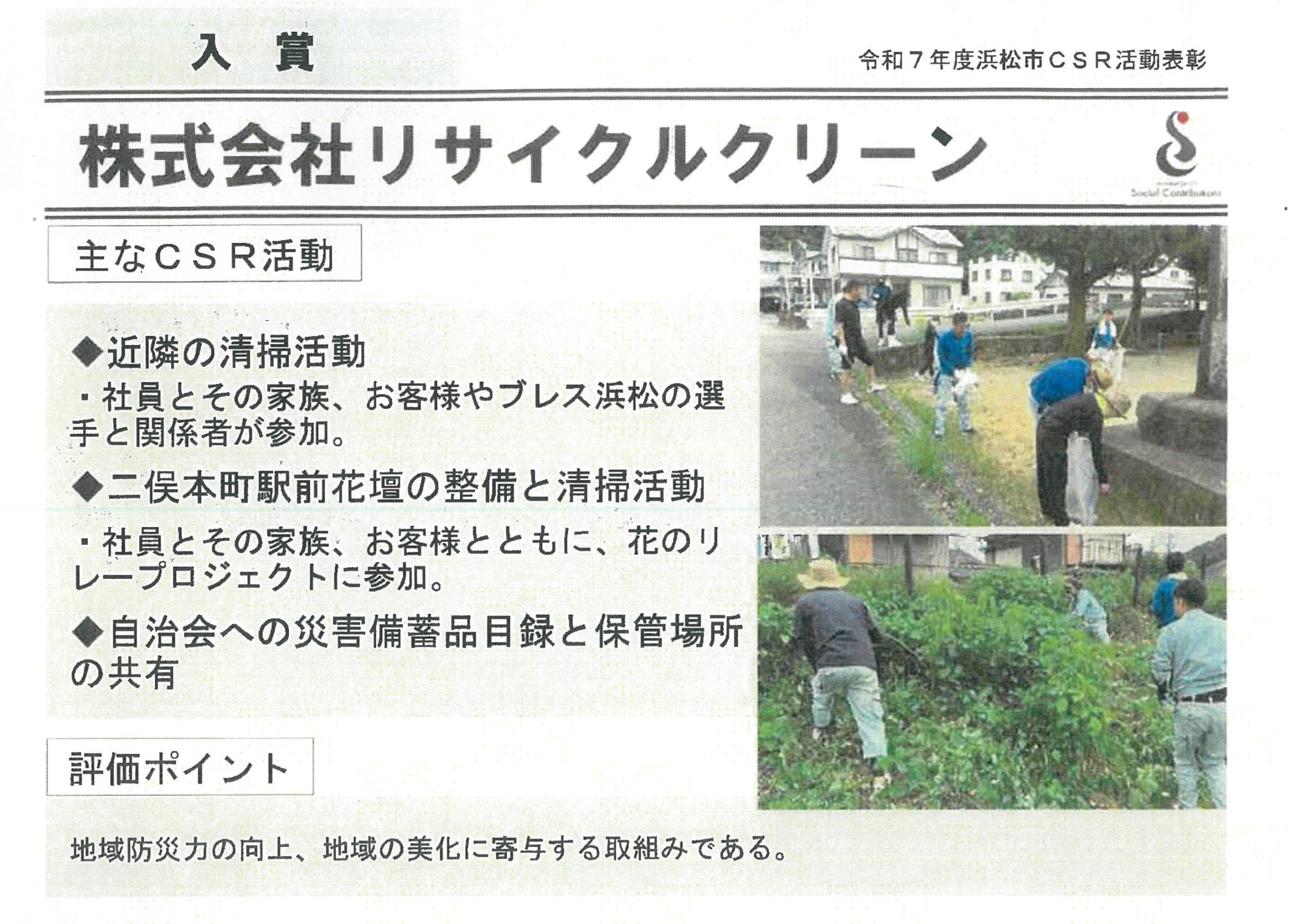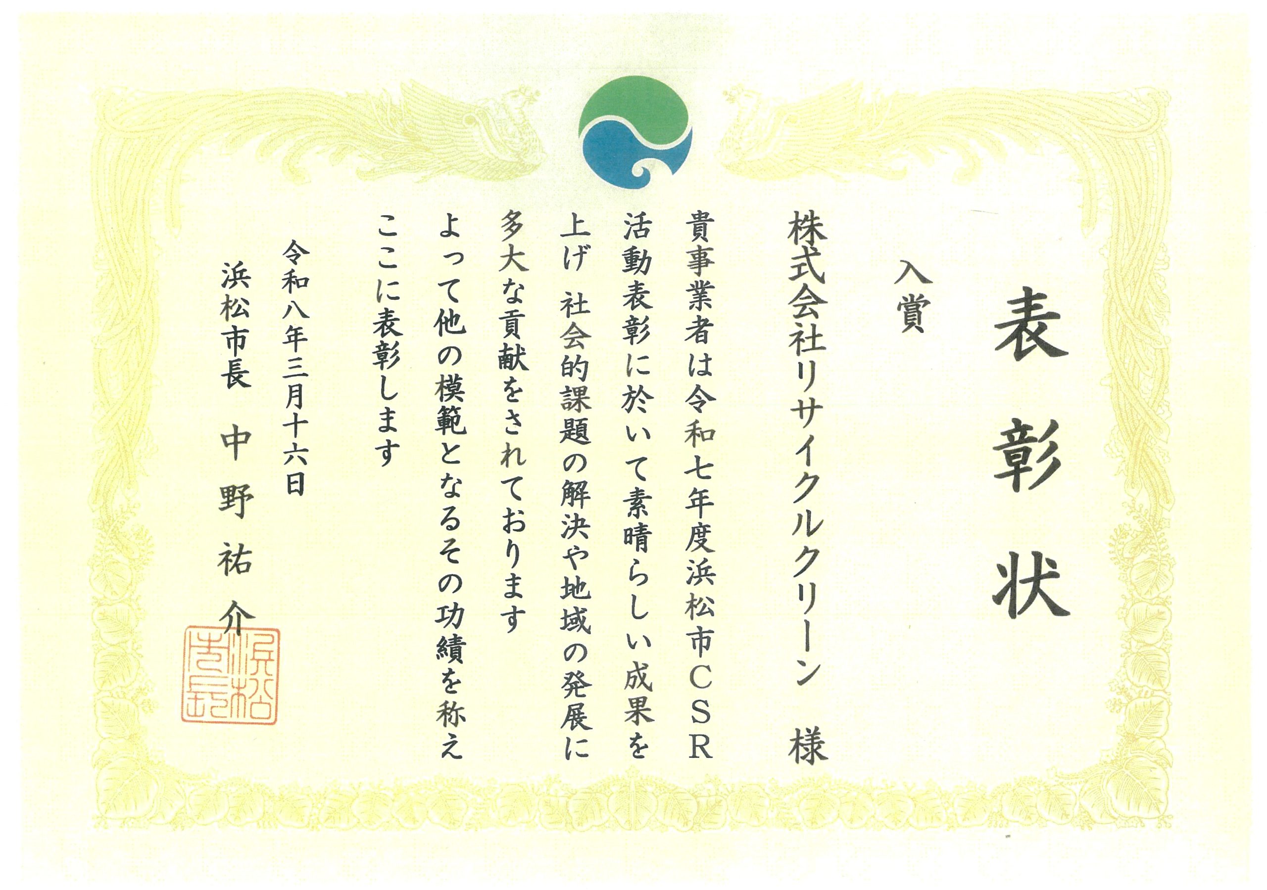 令和7年度の事業者の社会貢献活動及び従業員の地域活動への参加を対象とした「浜松市CSR表彰」において、「株式会社リサイクルクリーン」は「入賞」の表彰状をいただきました。