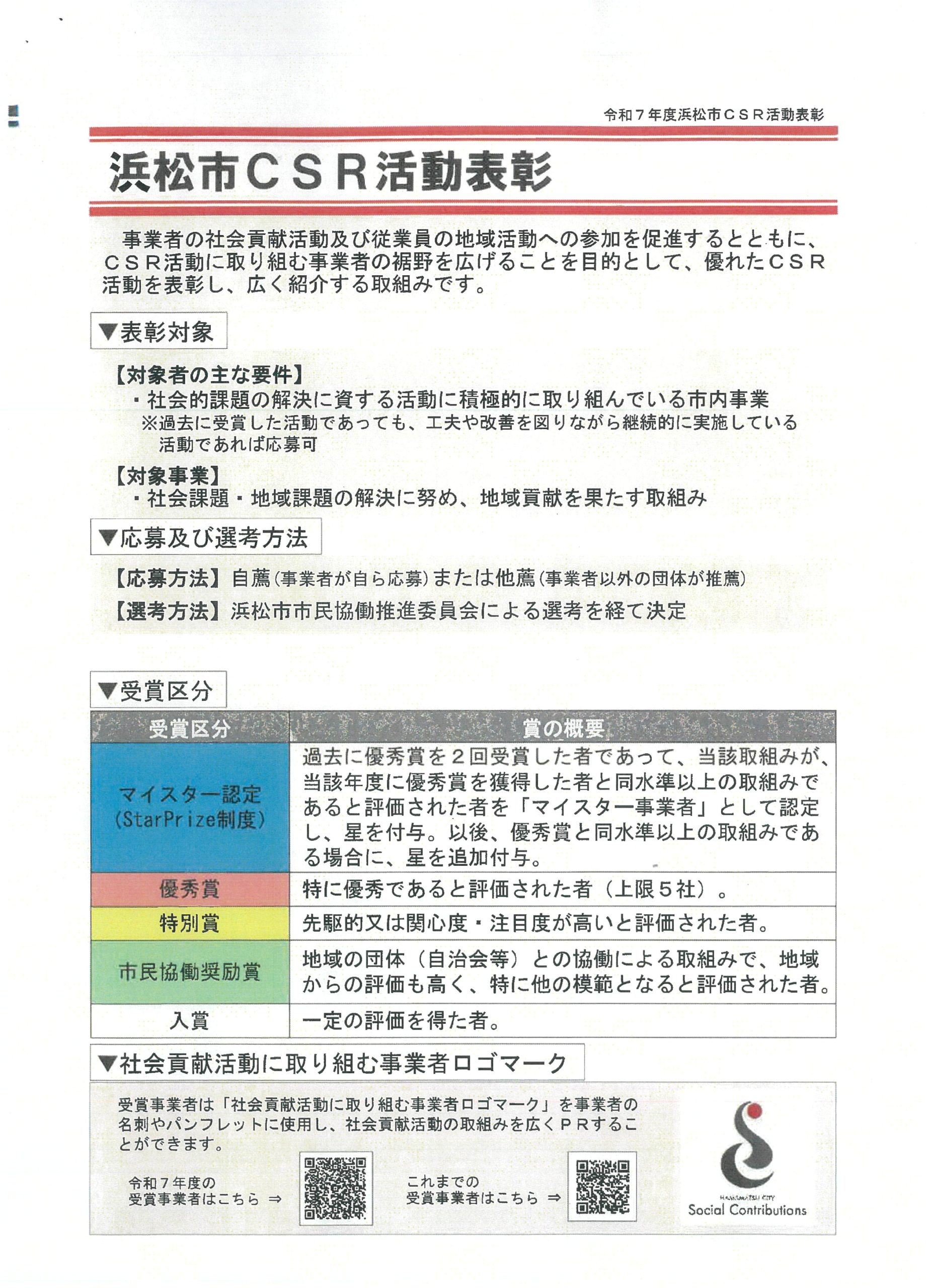 「浜松市CSR活動表彰」の表彰状をいただきました。