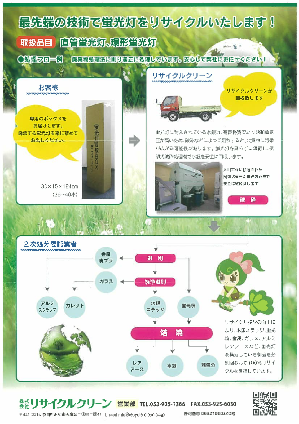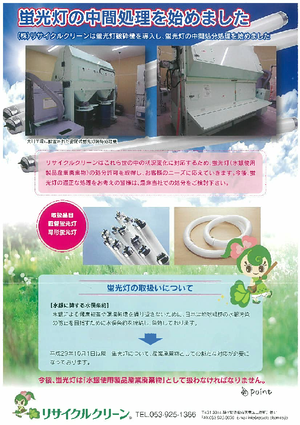 株式会社リサイクルクリーンは密閉式蛍光灯破砕機を導入し、蛍光灯の中間処分処理を始めました。蛍光灯には水銀という有害物質が入っているため、適正に処理を行わないといけません。家庭から出たものは地方自治体で処理できますが、会社から出た場合は水銀使用製品産業廃棄物として扱わなければなりません。