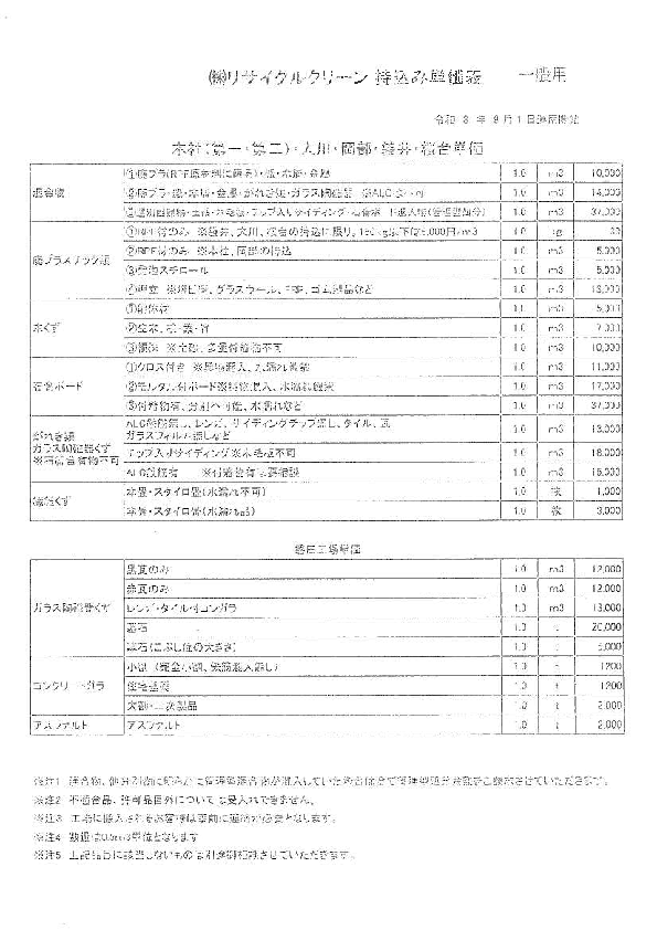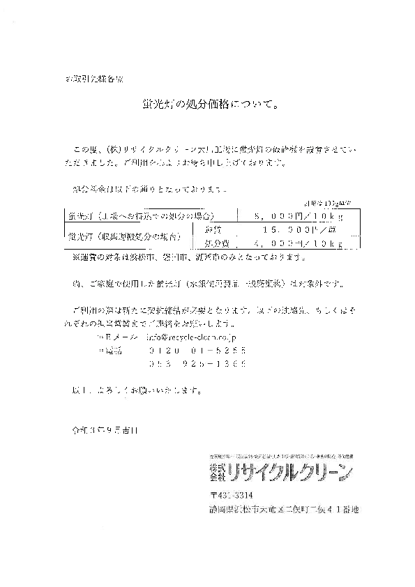弊社各中間処分場へお客様が持ち込まれる廃棄物の処分料金を改定(一部値下げ)しました。弊社中間処分場は、本社・第二工場(浜松市天竜区二俣町)、大川工場(浜松市天竜区大川)、桜台工場(浜松市西区桜台)、磐田工場(磐田市大久保)、袋井工場・袋井RPF工場(袋井市村松)、岡部工場(藤枝市岡部町宮島)の8工場となります。お近くの工場をご利用ください。また、価格表では分からない品目については、弊社営業部までお問い合わせ下さい。053-925-5730、053-925-1366