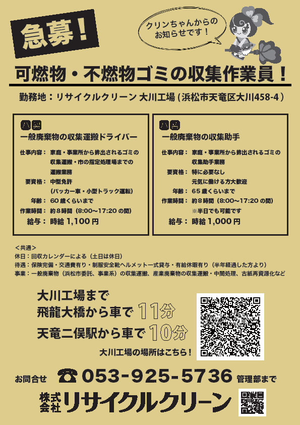 求人の問い合わせは リサイクルクリーン管理部 TEL 053-925-5736