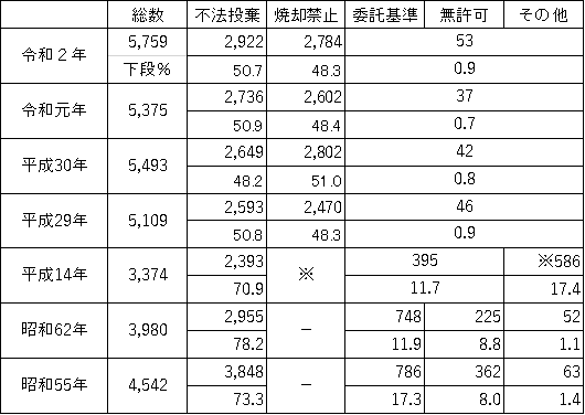 その中には、「廃棄物処理法違反者の検挙状況」が掲載されていますので、過去の白書から得られた情報と併せて見てみたいと思います。