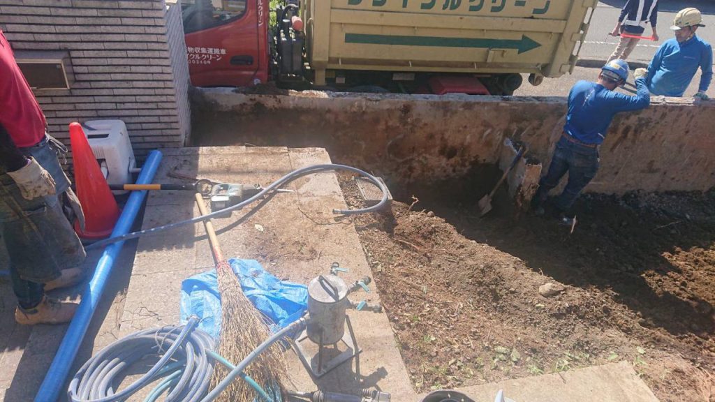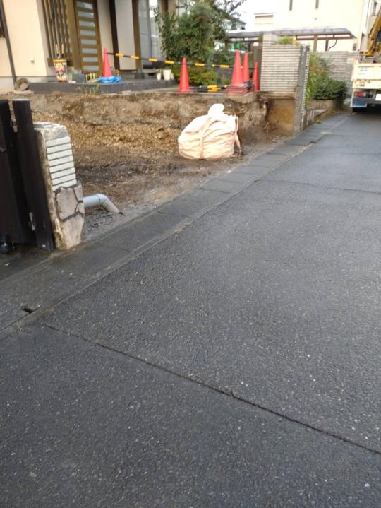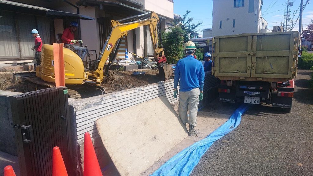 化粧ブロック壁の上の部分を解体した後、残土の搬出を行いました。
