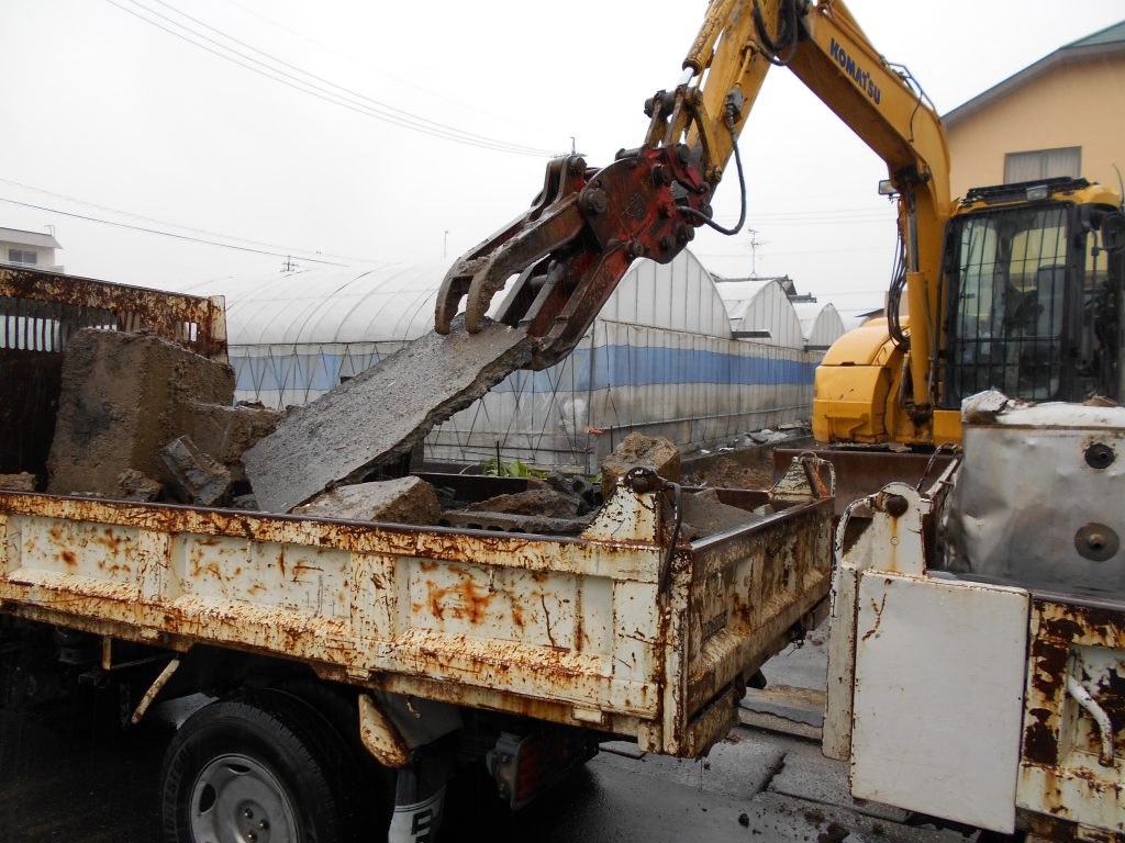 基礎も重機にて解体していきトラックの荷台に積み込みます。