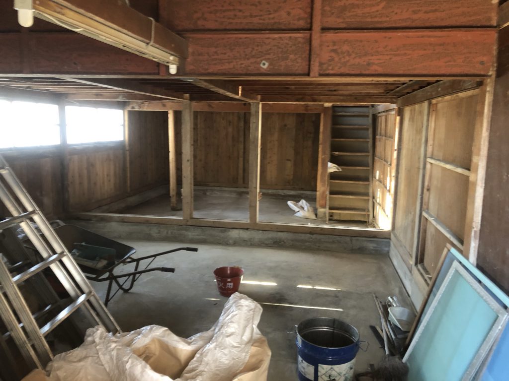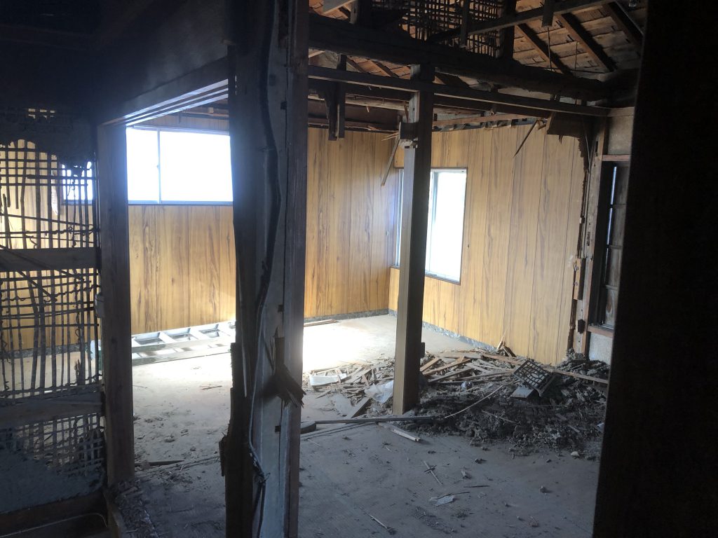 母屋については内装材の撤去(土壁など)を行い、躯体のみにしていきました。