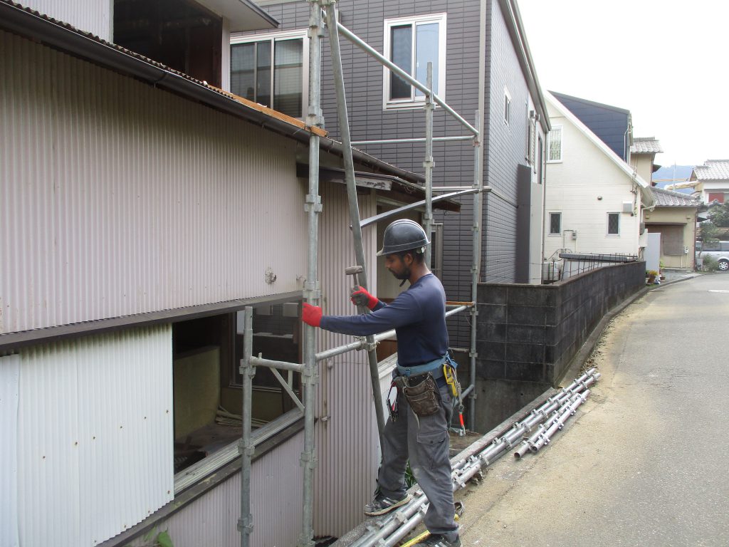 外壁のトタンをはがしていき二階と同様に骨組みだけにしてから解体していきます。