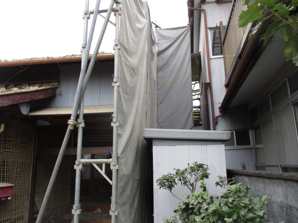 瓦降ろしの前に足場養生を立てます。