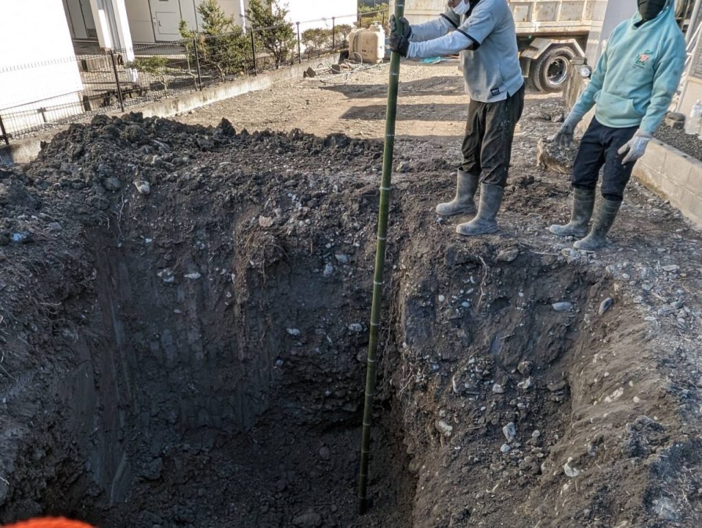 古く深い井戸が有ったためお祓い後息抜をして撤去後適切に埋め戻しました。