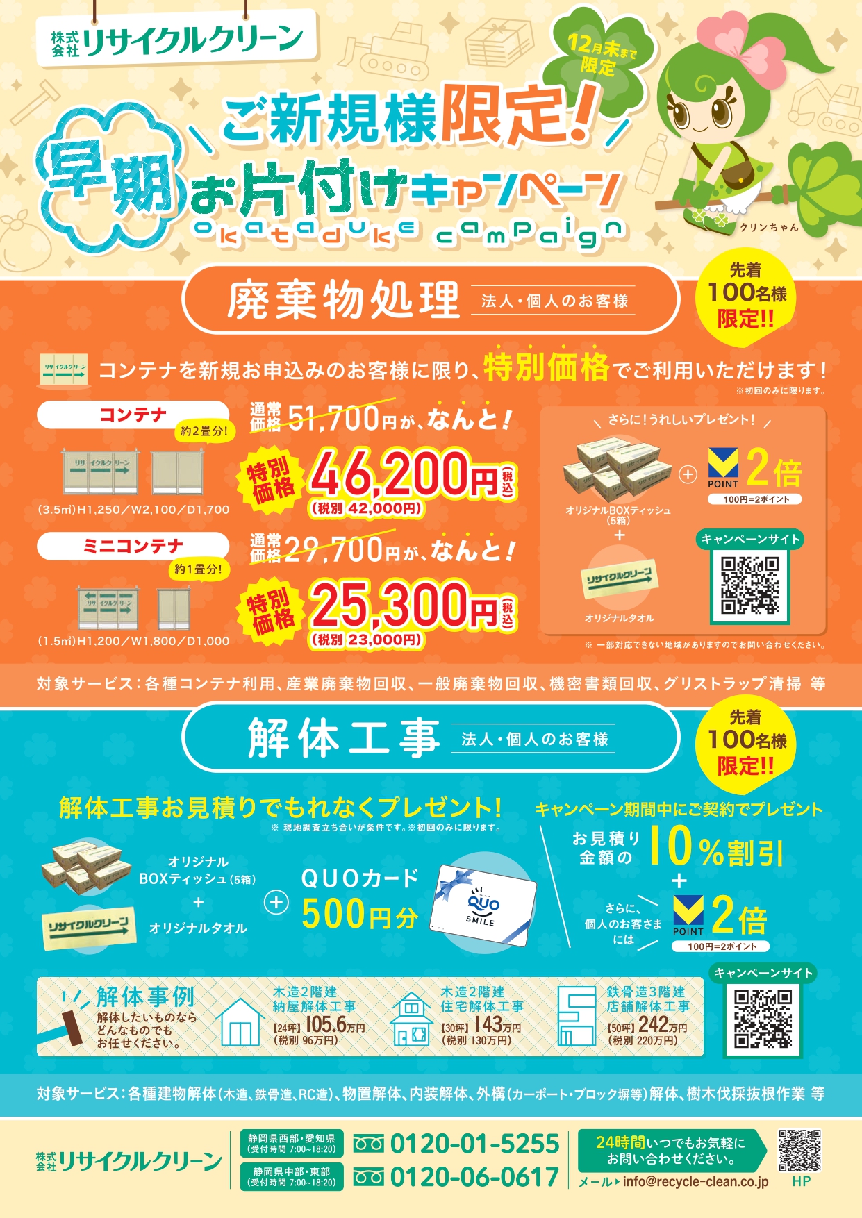 10月15日~12月末の実施の【先着100名様限定】早期お片付けキャンペーンのご案内です。