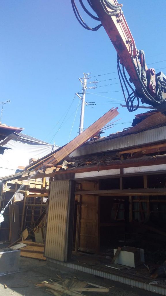 内装解体及び瓦降しが完了し、それぞれ建物の躯体だけにしたら、重機の登場です。