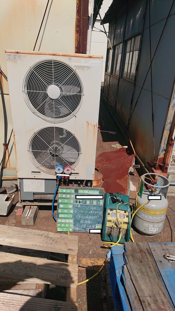 電源は利用できませんでしたので、発電機を用いて冷媒回収していきます。