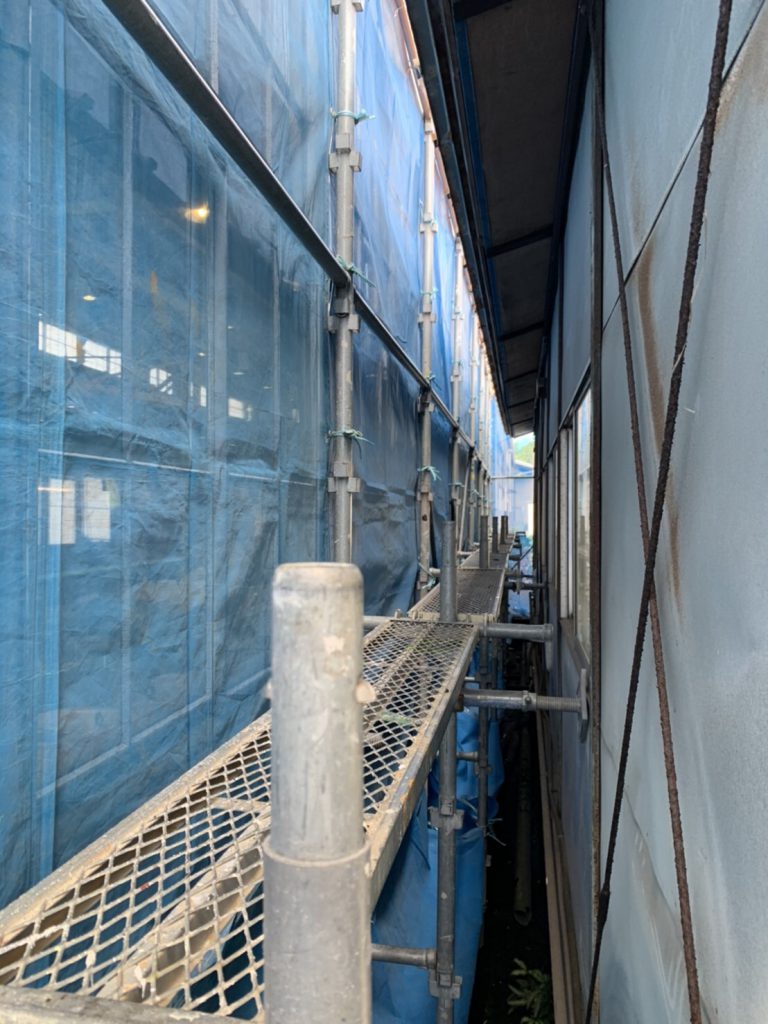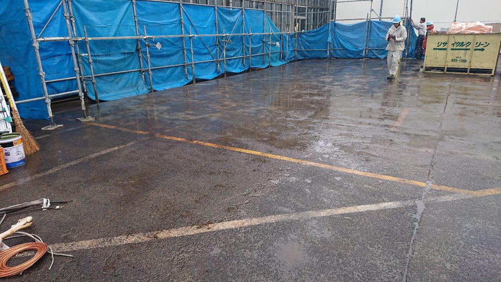 プレハブの建屋とはいえ内装材の飛散防止のためにシート養生を行います。