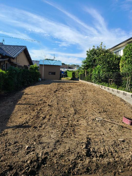 建物の基礎の撤去を行い、庭木や駐車場の土間も撤去して完了です。