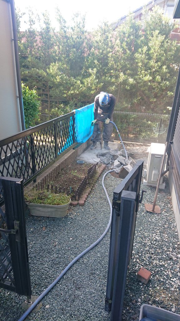 コンプレッサーを使った斫り作業で土間を壊していきます。