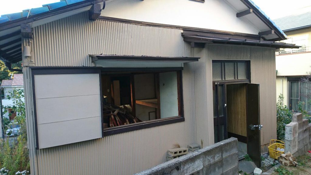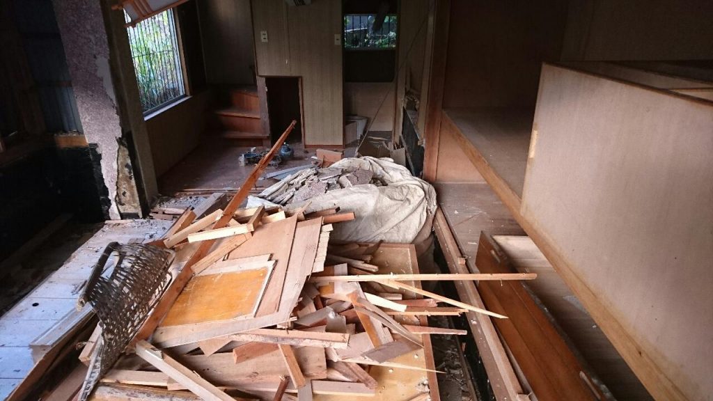 さて、今回の現場は傾斜地に建つ木造平屋です。と言いたい所ですが、傾斜を利用した半地下室のような構造で、斜面がありためトラックが入らず、手作業となる現場です。