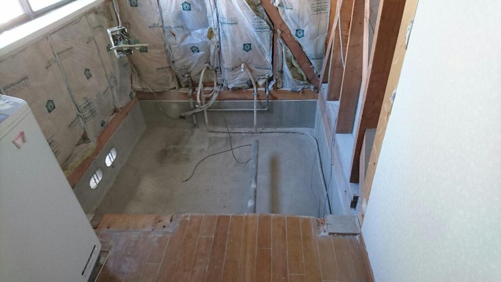 さて、今回はリフォーム工事の現場です。お風呂やトイレ、台所のリフォームは築後の年数によりどうしても必要になるものです。こうした工事はお施主様が住んでいる中での平行作業になりますので、特に気配りが必要です。