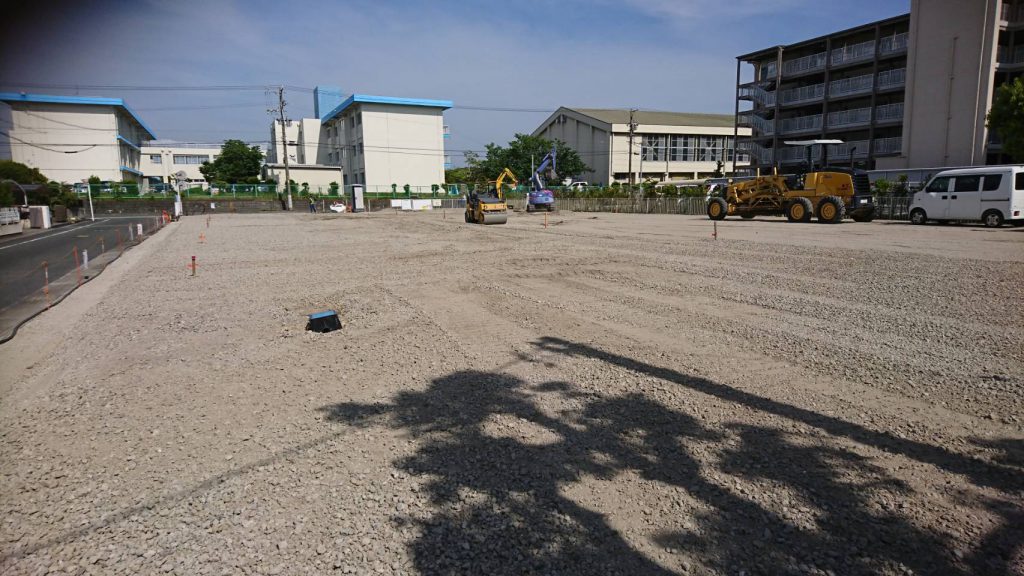 解体完了後に水勾配をとり、磐田工場よりコンクリートがらを砕いて製造した再生砕石を敷き均し、転圧をしました。