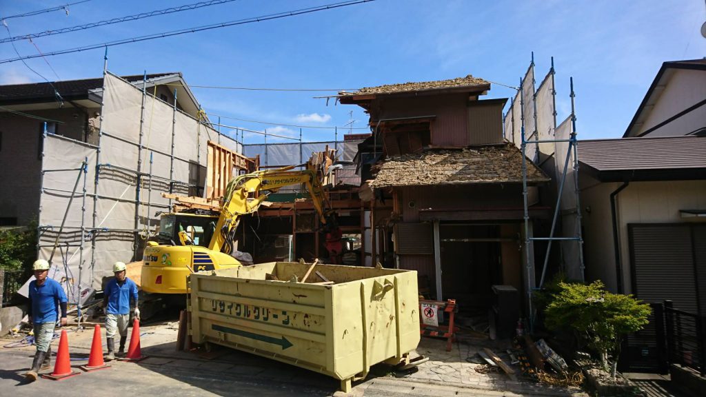 作業スペースを確保する為、内装解体完了後、下屋の瓦を撤去し、ミニバックホウで作業スペースとなる部分の解体を行いました。