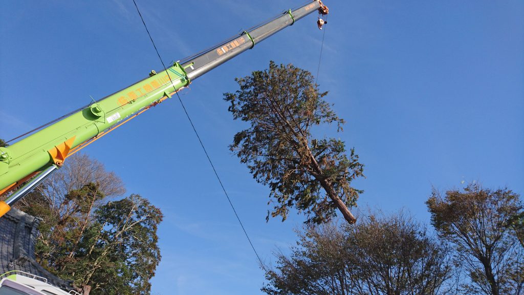 レッカーで樹木を吊りチェーンソーで2回に分けて