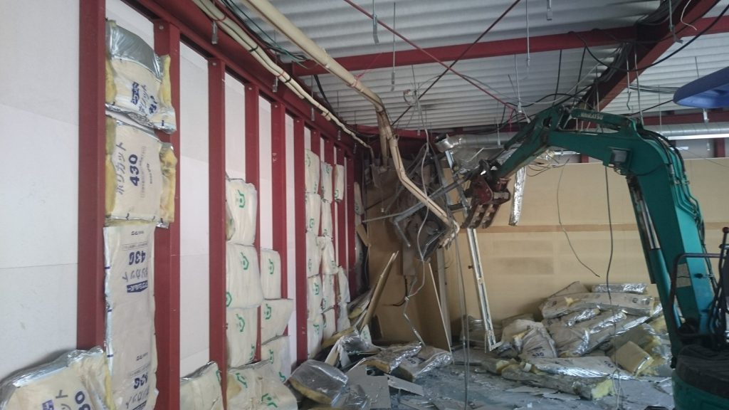コンビニエンスストアは居抜き状態となっている為、什器類や冷蔵庫といった物はなくなっており、着工日から内装の解体を重機を使用して施工しました。