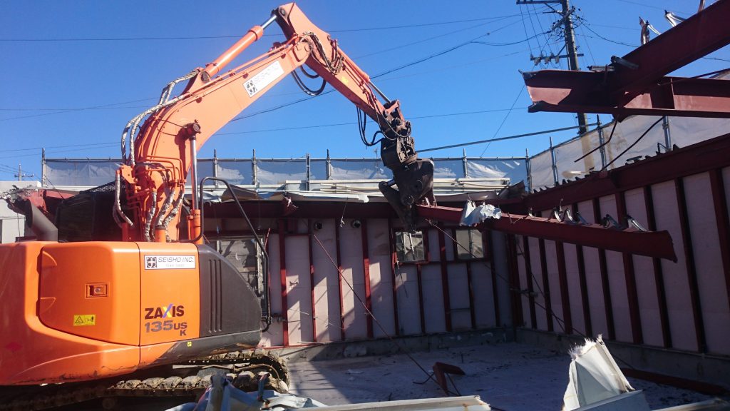 鉄骨造の為、鉄骨カッター(アタッチメント)を、使用しての解体となります。
