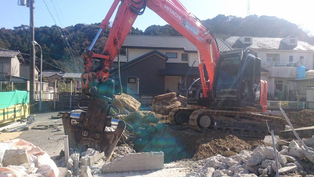 柱が少なく空間を広く取るため、基礎もガッチリとしており、大きなフーチング基礎に地中梁もしっかりしている為、これまたアタッチメントの登場です。基礎のときは大割クラッシャーを使用します。