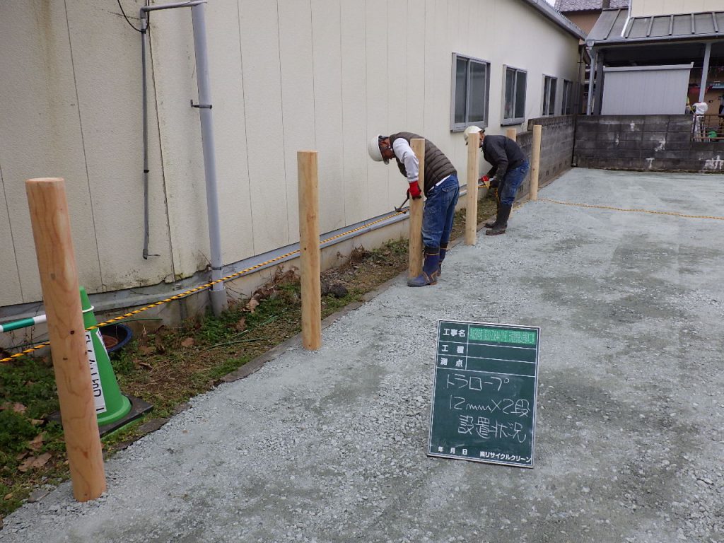 木杭の垂直やトラロープのたるみに注意して施工しております。