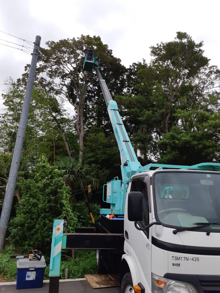 もちろん、再開前には、蜂撃退のスプレーをガンガン散布して、これなら大丈夫を確認してから作業を行いました。作業は、高所作業車を使用し、枝払いから徐々に幹を落として、後に集積搬出です。