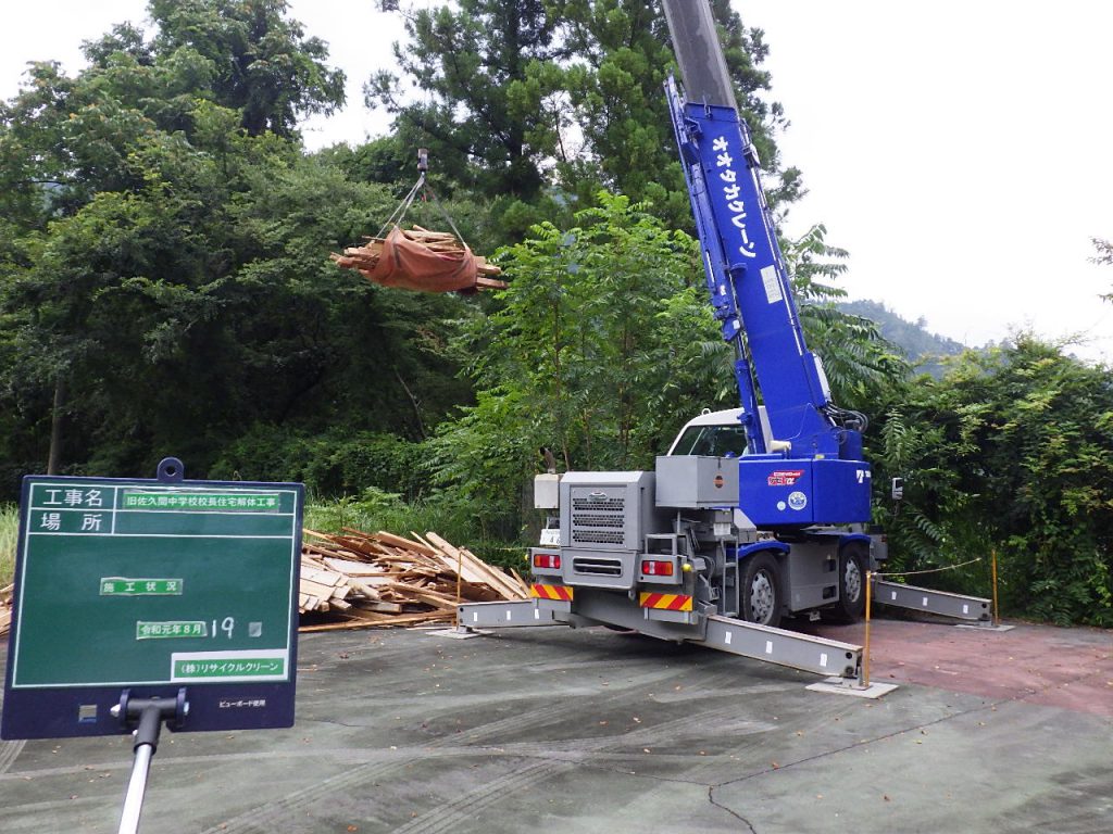 現場は、直接重機が搬入できない場所で、人力解体作業となりました。搬出は、クレーンを使って行いました。