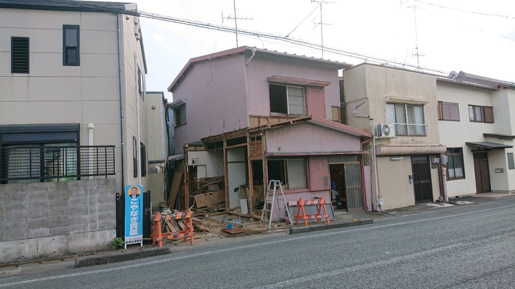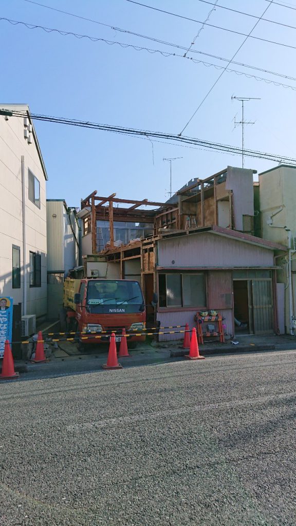 道路いっぱいにたっているため、手解体をしトラックの駐車場所を確保し、機械が入るまで手解体にて施工しました。
