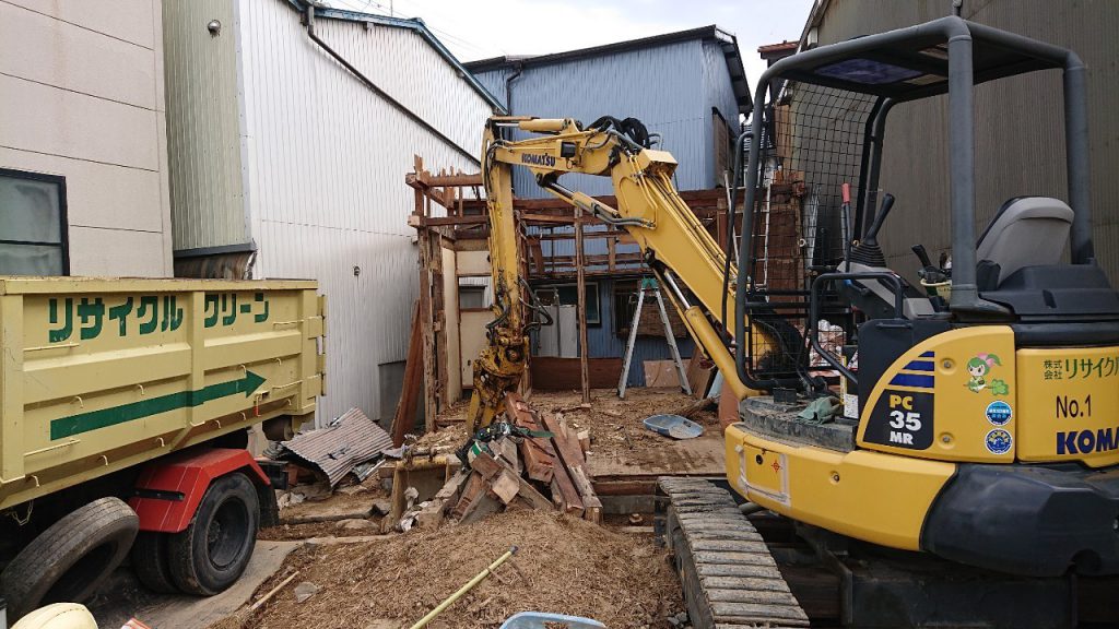 重機の作業スペースができてからはミニユンボの(ツーピース)にて上屋の解体てすです。