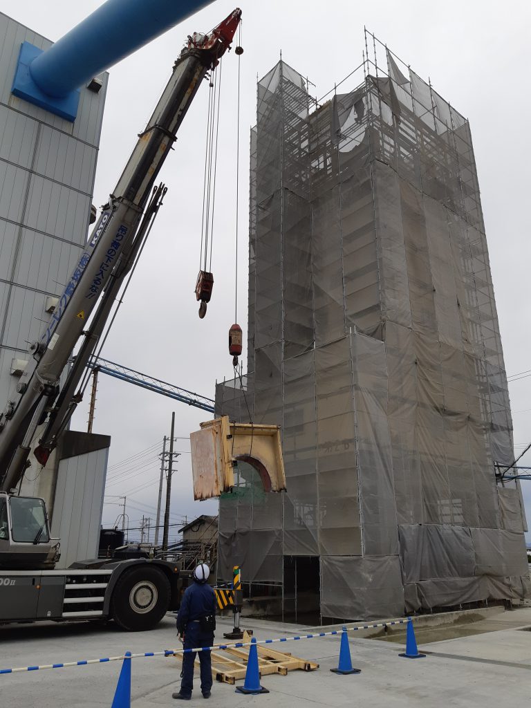 上記は、順次外壁材と内部のプラント設備をレッカー作業にて解体荷卸し作業を行っている模様です。