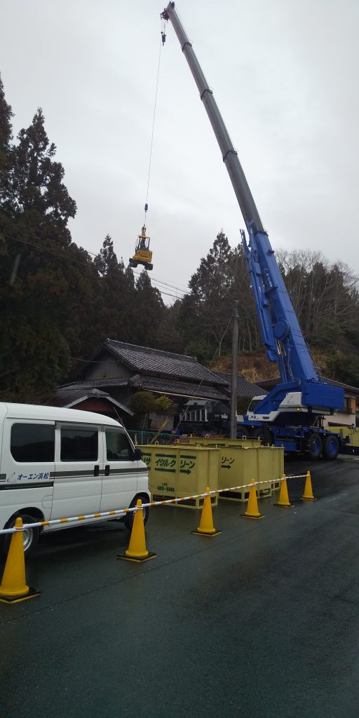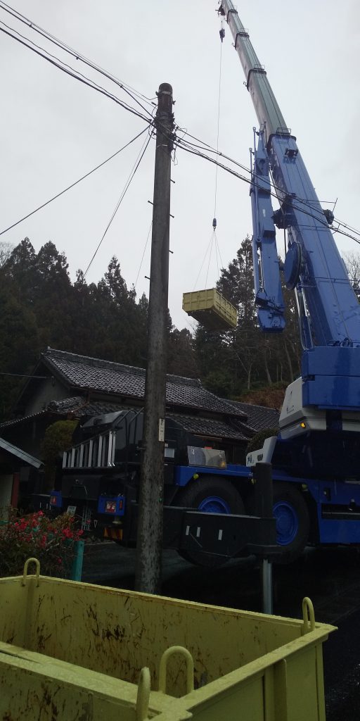100トンのレッカーにて搬入しました。現場までの道路幅が狭く通行の際、入り口と出口にて近隣住民に協力を頂きました。