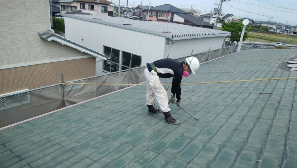 さて、物件ですが、カラーベストという石綿が含まれた建材を使用されていたので、1枚づつ邸内に取り外して許可のある処分場で適正に処理します。安全帯は必須です。