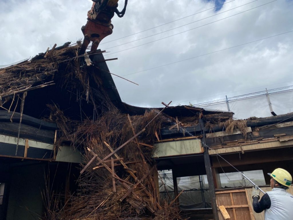 囲炉裏のすすや、歴史によってたまった埃の飛散に注意しながらの解体となりました。