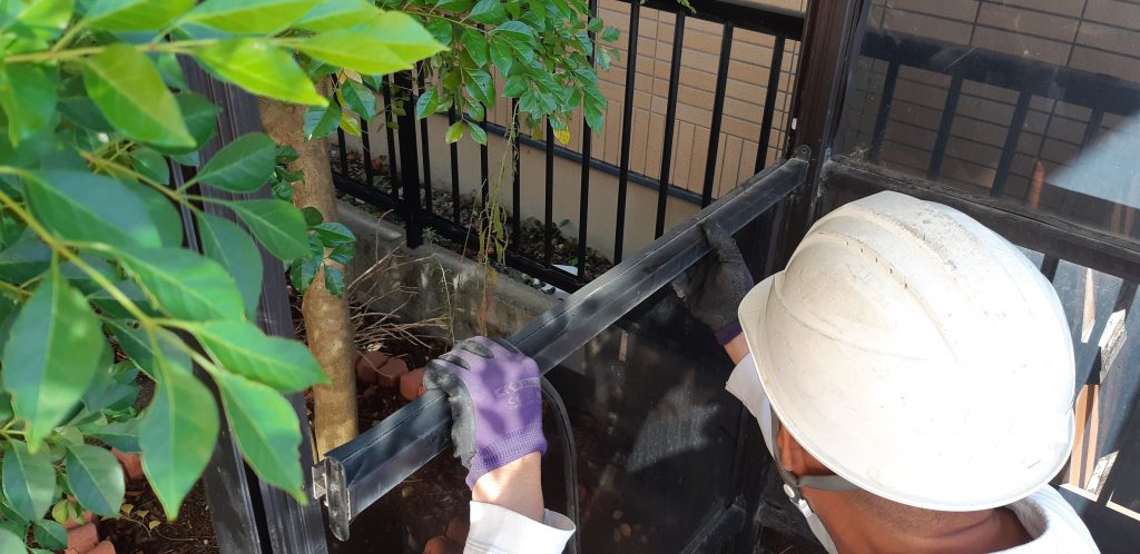 自宅と隣家のフェンスとかなり接近しているためビスを外しながら