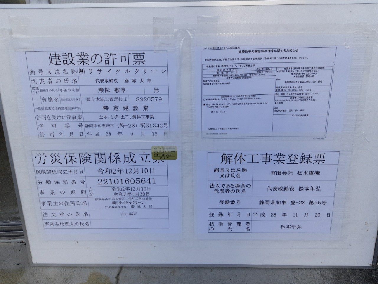 解体現場は、静岡県浜松市天竜区春野町気田地内にある鉄骨造平屋建て工場です。