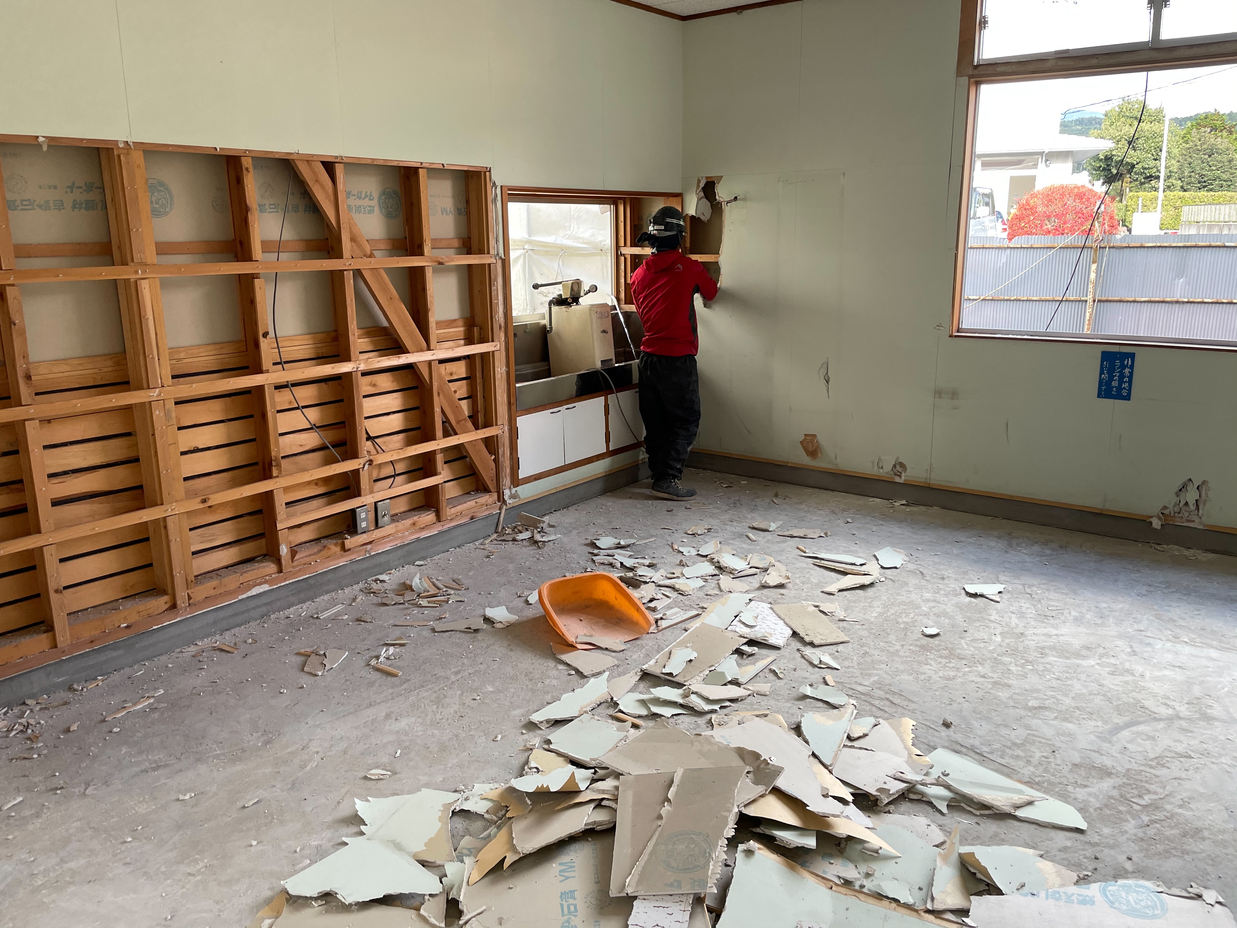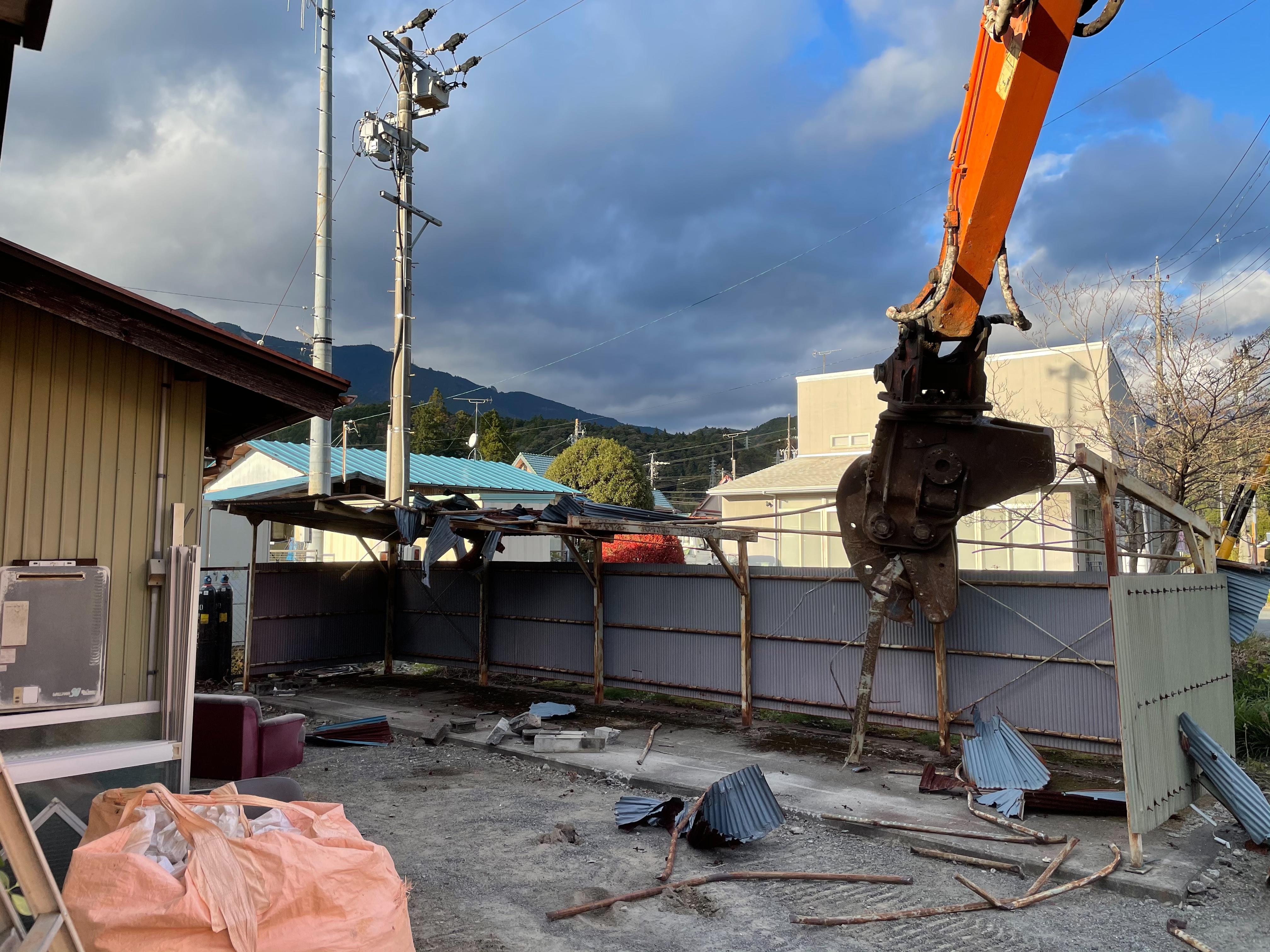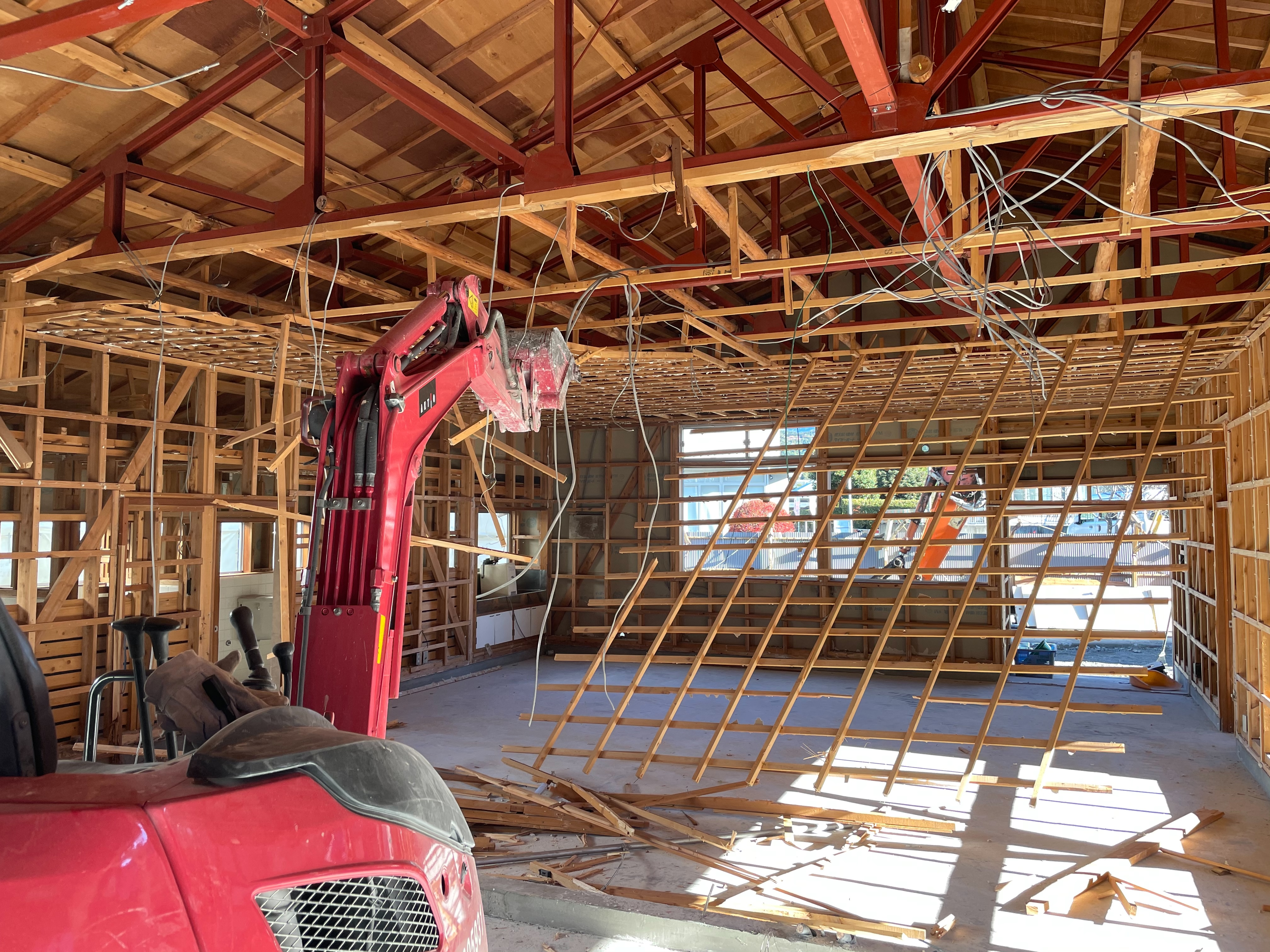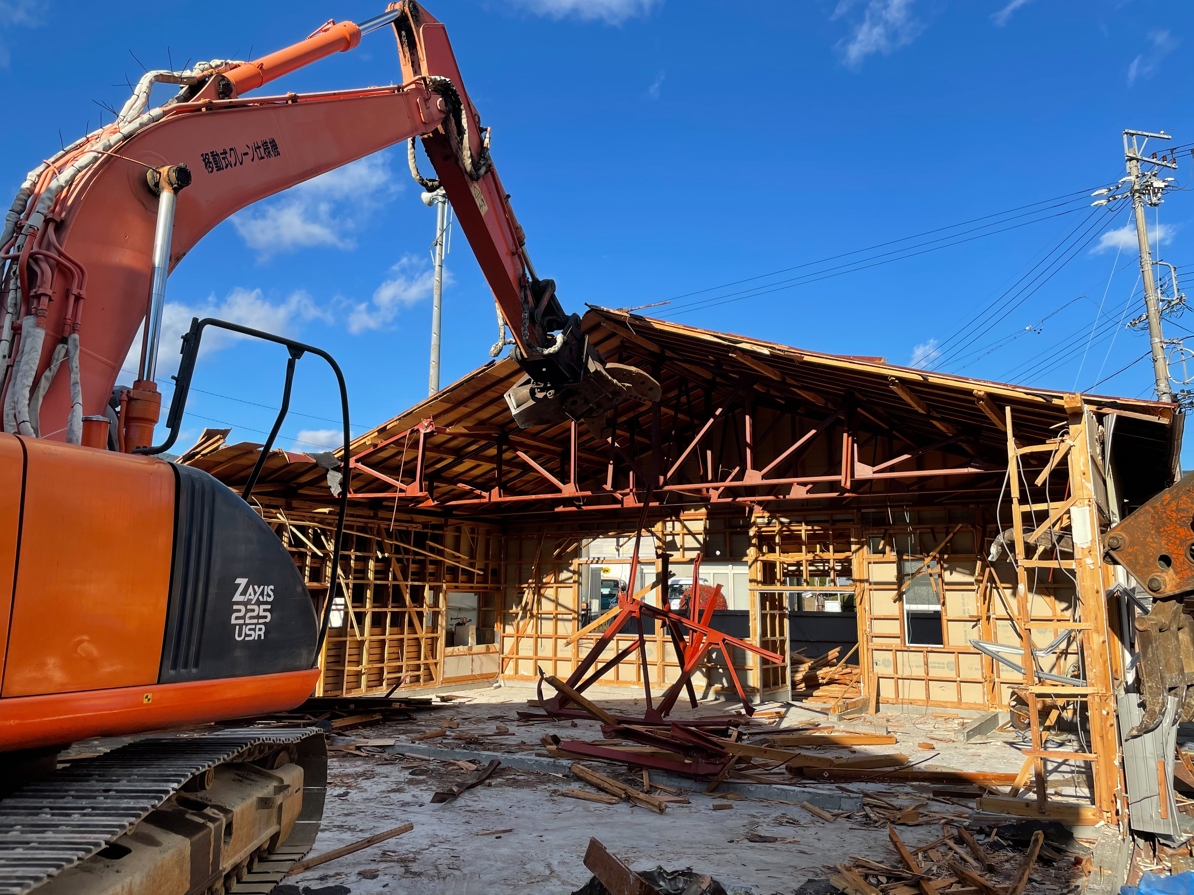 ある程度、内装が片付き始めたら、大型機械の投入で、屋根、壁を倒します。