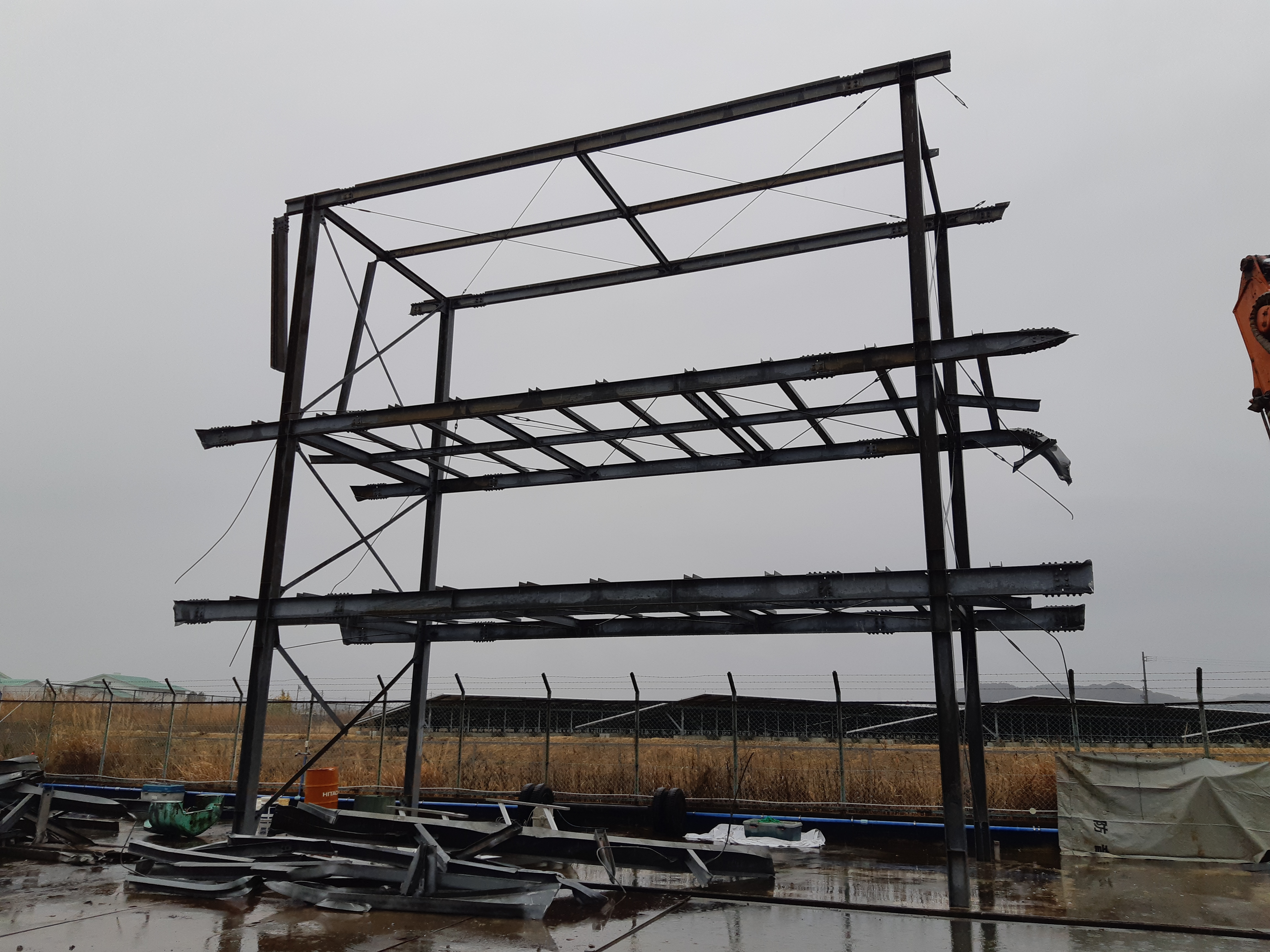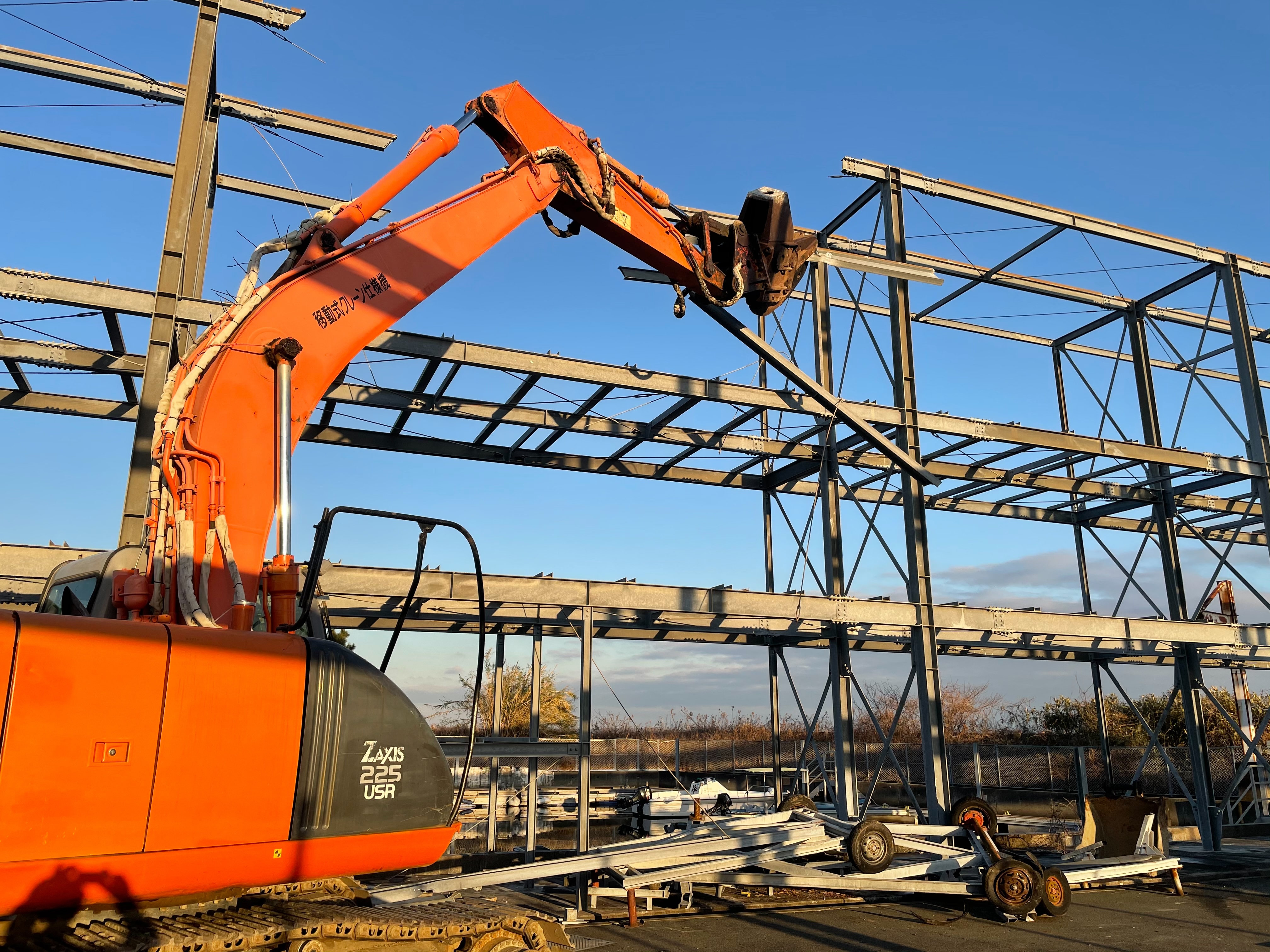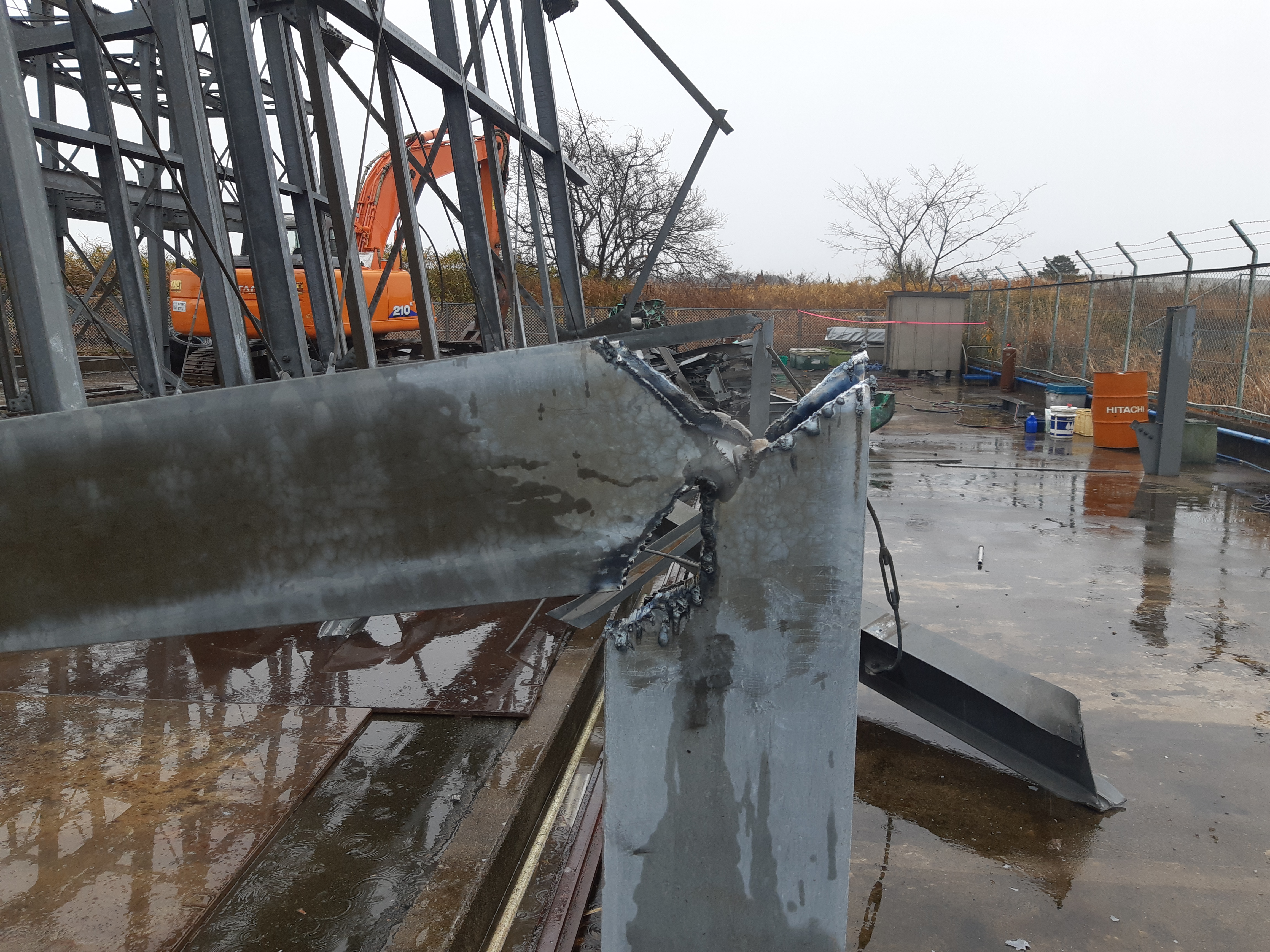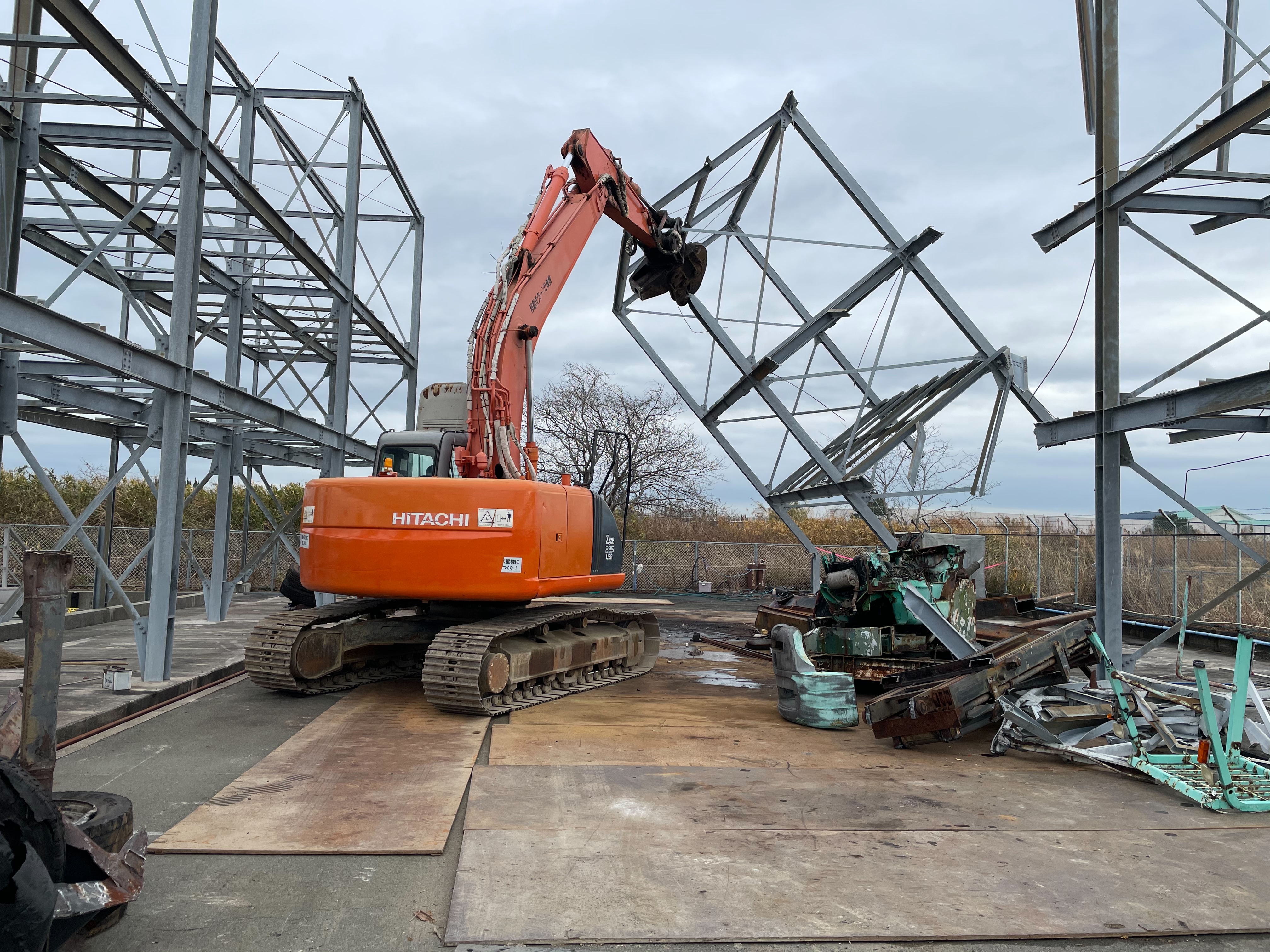 まずは最初に、重機のアタッチメント(鉄骨カッター)に変更して、各段の梁を切断します。床面を傷つけないように、敷鉄板を敷いて行いました。