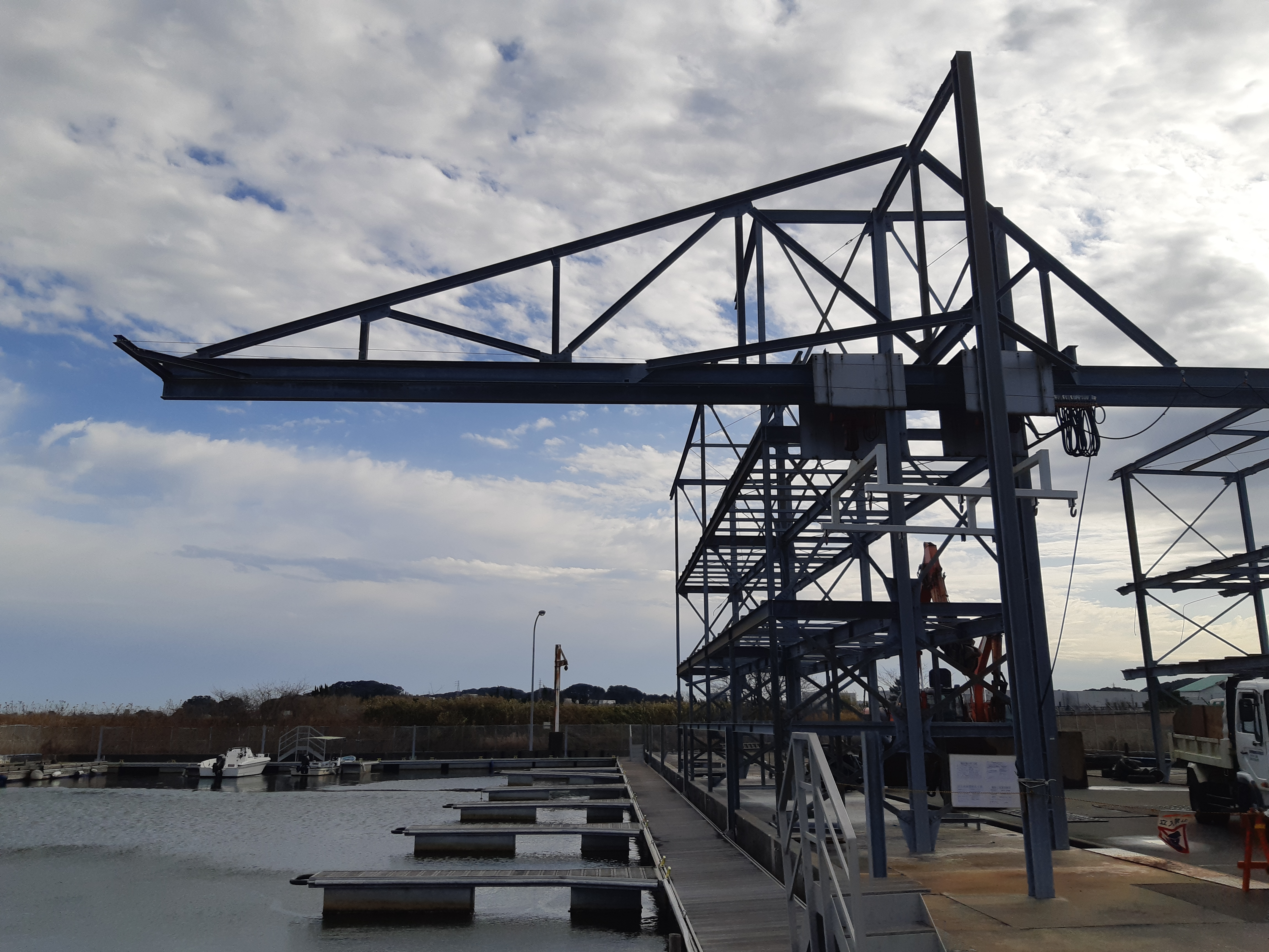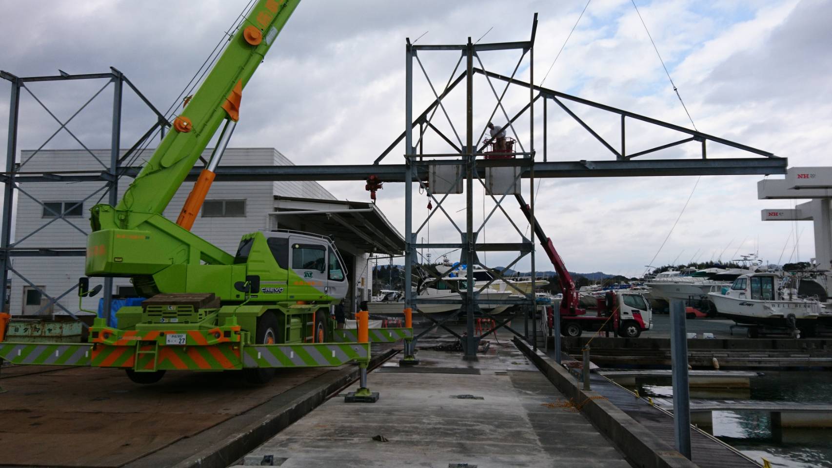 舟艇を吊り上げたりする施設は、クレーンを用いて解体しました。
