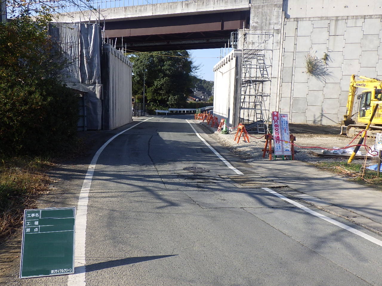 片側交互通行にて車両を通しながらの工事のため