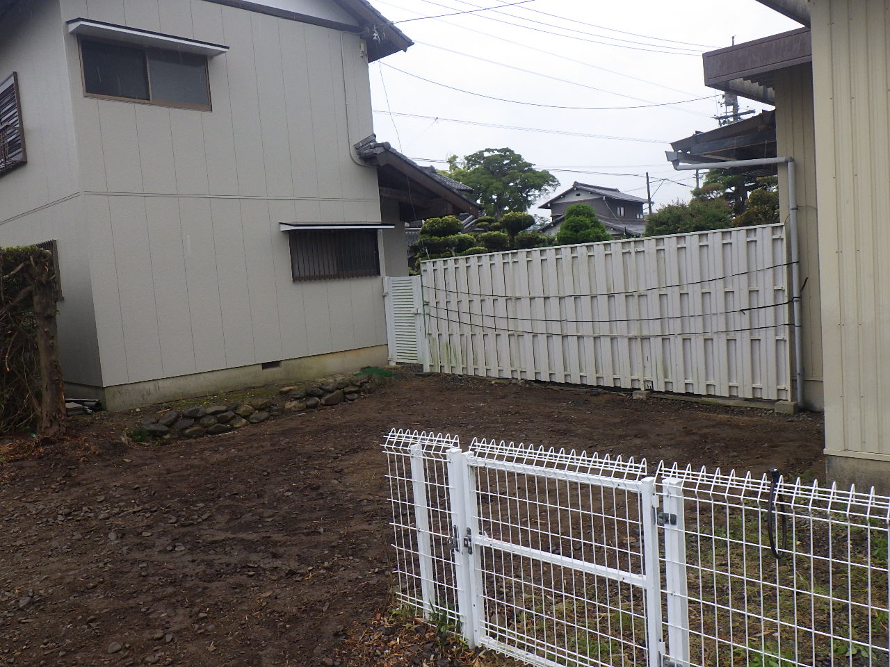 住宅側の木柵を残すため、私道側の樹木を伐採してから