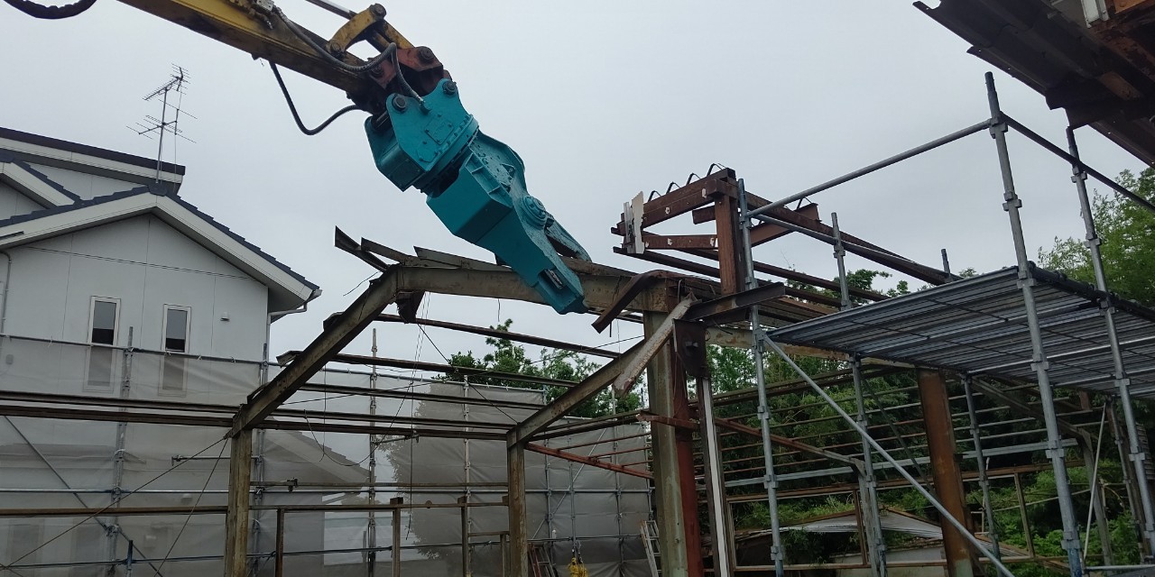 建具、スレート外壁、一部内装材の撤去を行い、その後鉄骨カッターを用いての上屋の解体です。