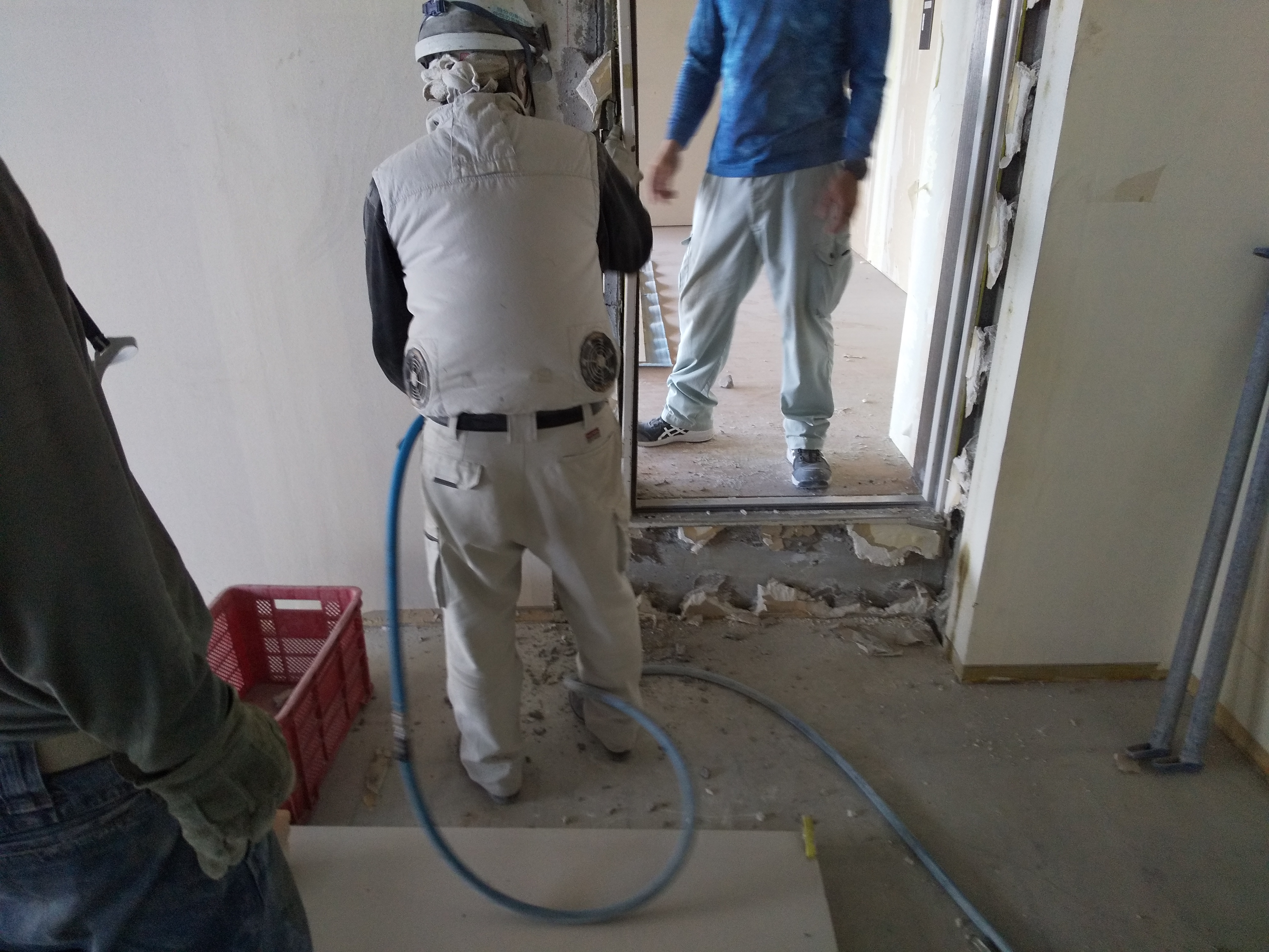 躯体に取り付けされている建具の取り外し状況です