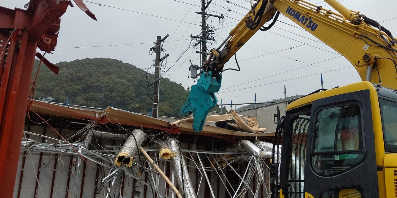 内装解体完了後、鉄骨カッターを使用しての上屋の解体です。